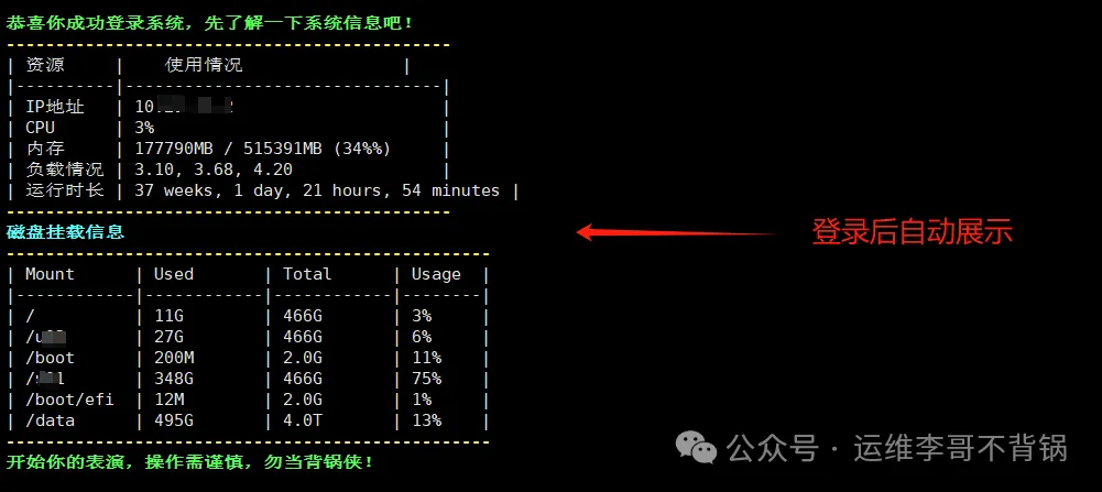 本文分享一个超炫的脚本,登录Linux服务器后,自动展示平时关注的系统信息,一目了然。