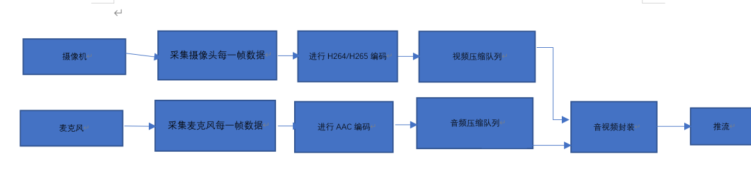 2.1.第一步:采集摄像头、麦克风的数据: 编码的第一步基本上都是采集视频、音频的数据,并把采集到的数据送到对应的音视频编码器。视频数据送到H264/H265编码器,音频数据送到AAC编码器,编码处理过后分别送到视频编码队列和音频编码队列。