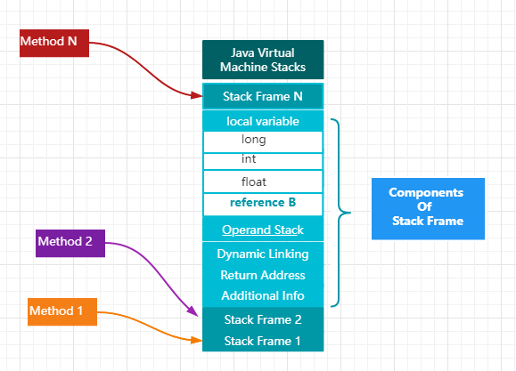 Java 虚拟机栈(Java Virtual Machine Stacks),早期也叫 Java 栈。每个线程在创建的时候都会创建一个虚拟机栈,其内部保存一个个的栈帧(Stack Frame),对应着一次次 Java 方法调用,是线程私有的,生命周期和线程一致。